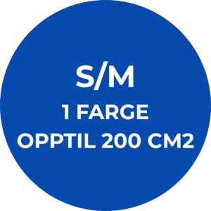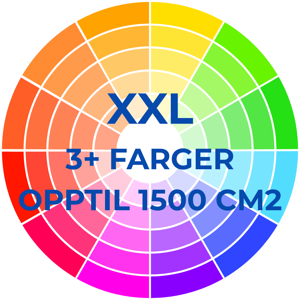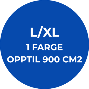 DTF transfermerke i 3 eller flere farger og størrelse fra 901 cm² til 1500 cm². Antall cm² finner du ved å gange lengde med bredde, 40 x 30 cm = 1200 cm². Én side kan maksimalt måle 57 cm.